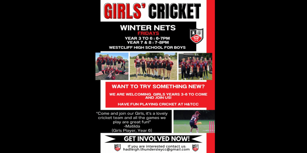 Hadleigh and Thundersley Cricket Club is looking to recruit more girls for the upcoming season. Winter training has just begun and will run until April at Westcliff High School for Boys. Sessions take place on Wednesdays, with primary-aged children training from 6:00–7:00 pm and school years 7 and above from 7:00–8:00 pm.